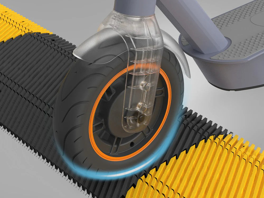 Smooth 10-inch pneumatic tires to absorb bumps, ensuring max comfort, max road 100 kg.